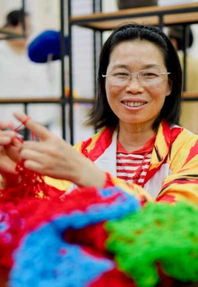 这不是普通的艺术展,而是残疾女性就业成果的“真实亮相”。作为五华区残联扶残助残的核心平台,工作室多年来始终以“赋能残疾女性,助力就业增收”为方向:累计开展近175期编织、刺绣培训,覆盖近1860人次残疾人及亲属;产出近3000件手作,其中“中国梦 民族情”刺绣作品还曾斩获省级奖项;更有10人考取国家工艺品制作(高级)证书,从“学手艺”到“教手艺”,在省内开展数千人次授课。此次展出的51件纤维作品,均出自工作室核心成员之手——她们把布依族粉蓝、土家族红棕、彝族鲜绿等民族色彩织进针脚,每一件都是“居家灵活就业”的实践成果,更是对美好生活的执着追求。