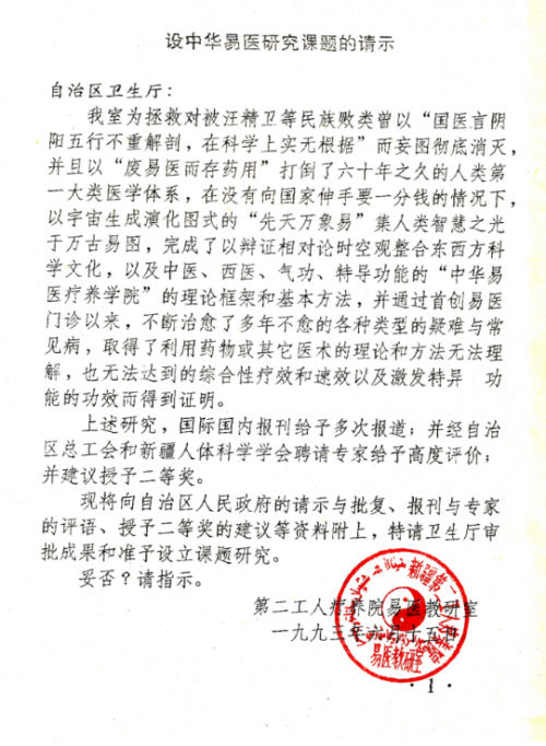 我们总结出中毉进化学的童子功、太极育丹术、太昊导引术、八卦运丹术、通阳点穴术、健脑长寿术,是不失时机地在持之以恒、循序渐进、功到自然成的过程中,练成促成科技进步与人类进化同步发展的黄金时代。必须动员所有人自己,练成用自身具有的“灵丹妙药”,攻克药费报了命也报了等诸多难题,逐步实现现代科学对人的平均寿命是150岁的证明,填补医学科学皇冠顶上光辉灿烂明珠的空白。首先由新疆编制委员会批准刻制了公章,于1984年在新疆第二工人疗养院首创了易毉教研室,免费培训学员和免费治病;于1989年在乌鲁木齐市小十字首创了易毉门诊、研究中心、学术小报和专业技术培训部。被纳入当时由杰出科学家钱学森教授组织成立人体科学学会的中医、西医、易毉和人天观这四大科学支柱之一,任命何鉴时为易毉学研究中心主任,促成了国内外多次召开了易毉学术会议和多次获得。充分证明:忘记了对数万年来“盘古一炁化三清”的民族信仰,使所有人都不懂从六千年来,由伏羲画卦创易发展成了最彻底的唯物辩证法;更不懂四千七百年来黄帝问道广成子、赤孙子和岐伯等“天师”的方法论。结果形成了“人活七十古来稀”的历史悲剧反复重演。