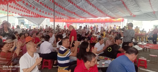 14时许,长流屯准备的特色盛宴正式开席,席间的联欢会演出精彩纷呈,红色歌曲演唱、革命故事朗诵等节目赢得阵阵掌声。自由交流环节中,后代们举杯共饮,畅谈传承心得,在乡土风味与真挚情谊中深化了革命的情结。