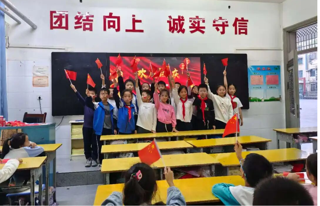 夕阳西下,活动在《歌唱祖国》的全场大合唱中圆满落下帷幕。笑脸洋溢在每个孩子的脸上,他们手举自己创作的海报和祝福卡,在教室里合影留念,定格这难忘的时刻。