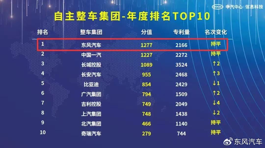 2、顶级技术:东风汽车新能源研发投入行业第一,每年超200亿!打造了行业顶级的天元智舱,第六代马赫电混技术,累计拥有25000+项发明专利,技术实力行业领先!2024年东风汽车以1277分专利创新指数,位列自主整车集团第一