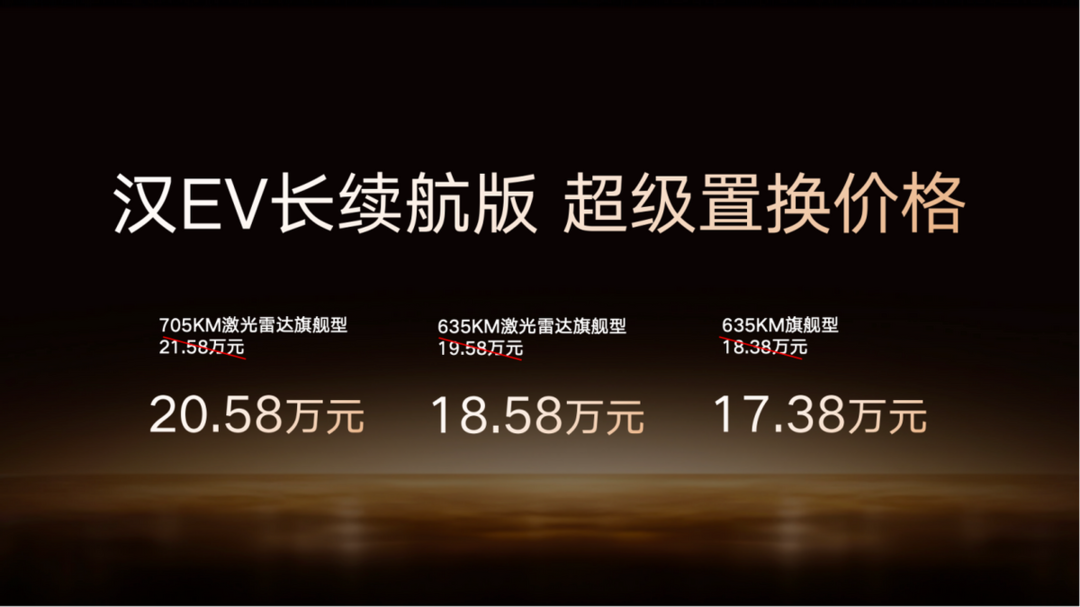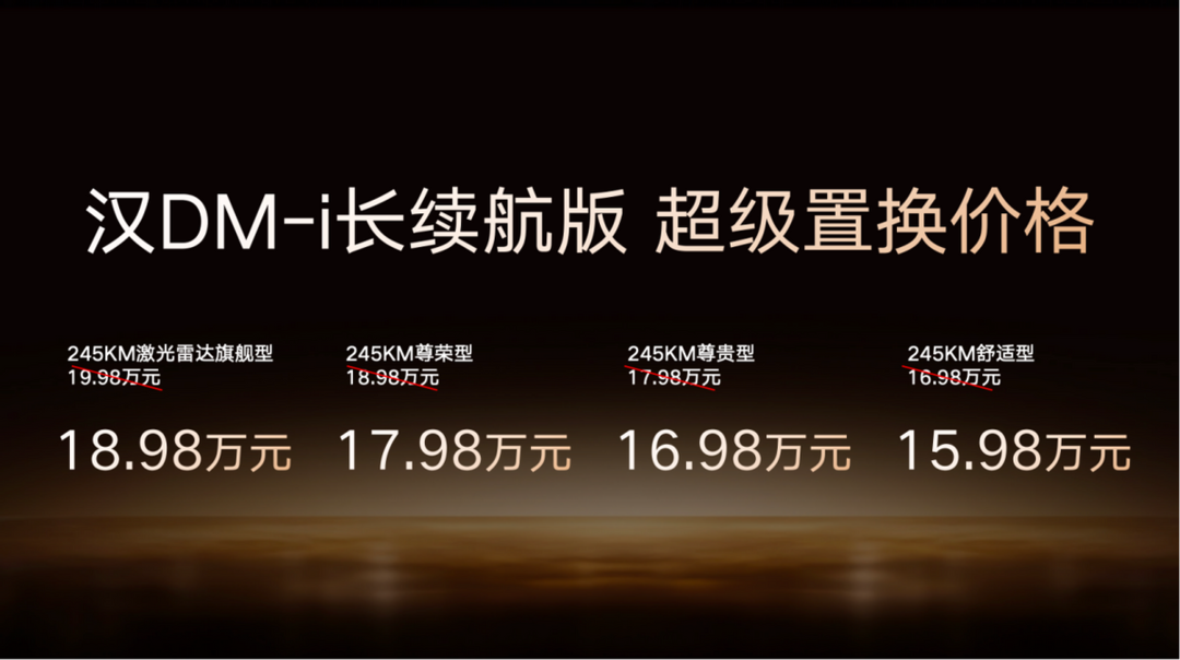 其中,汉 DM-i长续航版纯电续航提升至 245 公里,亏电油耗仅 3.44L/100km,补贴后官方指导价为 15.98 万-18.98 万元;汉 EV 长续航版共推出3 款车型,续航覆盖 635km 与705km,补贴后官方指导价为 17.38 万-20.58 万元。特别提醒:上述补贴后指导价,需在 10 月 31 日前完成购车并享受 1万元超级置换补贴,属于限时优惠价格。