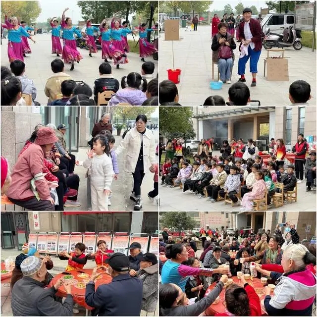 活动当日清晨,天中义工的志愿者们便投入到紧张而有序的准备工作之中。择菜、洗切、烹煮……各个环节分工明确,衔接流畅,展现了项目执行团队高效的组织协调能力与标准化服务流程。炊烟袅袅,笑语声声,共同编织出一幅邻里互助、温情洋溢的画卷。上午九时,前张社区和安居新村的老年人陆续前来,幼儿园的小朋友也来到现场观看节目,与老人们欢度重阳。午宴上,老人们开心地围坐在餐桌上,一边品尝美食,一边唠嗑家常,现场气氛温馨热烈。