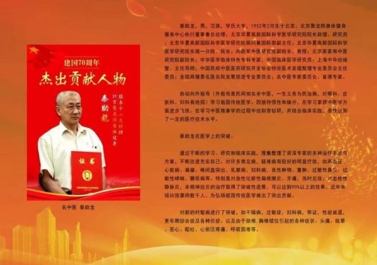 2024.12由 中国文化出版社出版印刷的《建国75周年国家中医药辉煌成就大典》任;特邀副主编,封面和封底人物及 184页刊载了(传承中医国粹 护佑百姓健康--秦助龙院长)