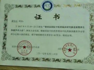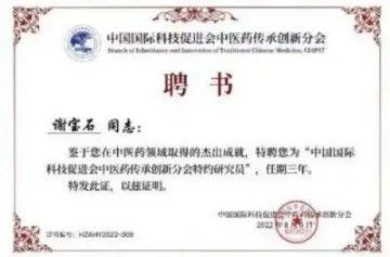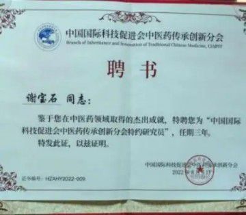 2018年4月,世界中医药学会联合会国际合作部颁发给谢宝石《谢宝石专家研发的〈宝石液〉显治骨伤、烧伤为人类健康首创》证书。