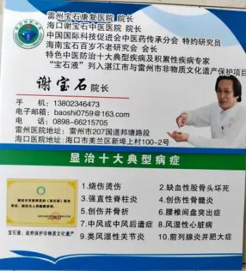院长谢宝石的中医骨伤、烧伤临床治疗技术堪称“世界一独”,成功治愈了无数患者。这是缘于谢宝石用中草药独特研制的“宝石液”一系列临床方药,采取“一人一方”专治,在临床上开辟一条新路,彰显“神奇”,书写他的“传奇”人生,为广大患者撑起一片蓝天,带来了生命曙光。近10年来,治愈十大典型病28690多例,治愈率达96%以上,深得广大患者满意。前来求医的患者不仅有湛江地区的,还来自北京、河北、哈尔滨、沈阳、云南、广西、海南、台湾等全国各地的,均得到满意治疗而康复出院。