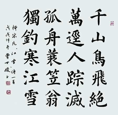 曹世俊先生自幼受父亲书法写作的启蒙熏陶,儿童时代聪明好学、兴趣广泛的他因家境贫困、生活维艰,天天不忘检根木棍练习书写,并养成了一生的唯一的爱好。在几十年的书法创作中,他坚持自学,一直秉持“外师造化,中得心源”,默默地面壁临池,孤独地与笔墨相伴,孜孜不倦,锲而不舍。他临帖墨碑,广涉博取,兼收并畜,将书画艺术“骨肉神韵” 气情融会贯通,逐渐形成了自己的独特的风格。注重功力,讲求笔法,他的行楷行笔力透纸背,墨法浓淡有度,结体飘逸潇洒,融碑帖于一炉,运笔可见北魏郑文公碑,、崔敬邕墓志、张猛龙碑的痕迹,有可见“二王”划空取势之腕力;构架从唐人欧阳询、诸遂良、李邕等大家,又借宋代苏、黄、米、蔡之体态,古笔新意,美换成天。其小楷如大家闺秀,信步探春,逶迤款款。其擘窠榜书如寿山巨石,润泽遒妍,如长空鸣鹤,劲舞击空;他的立轴及手卷书法畅韵淡雅,不媚不俗。布阵总揽如乐队,坐立肃然,似在演奏出激越悠扬或梦幻之协奏曲,而每个汉字又似乐手,尽显自己的独立音色。他的艰辛生活的砺练更使他的书法艺术增添了些苍劲和豪气,与动静之间尽显丰富深刻的意境内涵和多彩的精神世界,又有阳刚之壮美和不缺阴柔飘逸之姿,字里行间渗透出形式、力度、结构的之美。