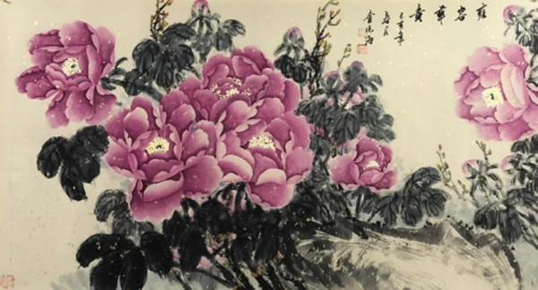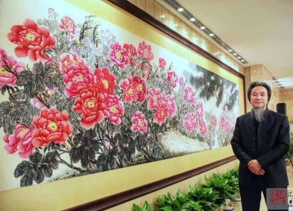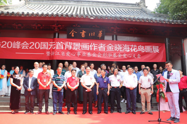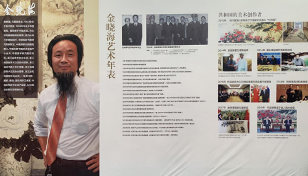 金晓海1963年出生于浙江临安,现任中国民族书画研究院副院长、中南海紫光阁画院院士、杭州兰亭画院院长等职,师从中国美院花鸟画家陆抑非教授。作品被毛主席纪念堂、北京人民大会堂、天安门城楼等收藏。G20峰会举行时,普京等20国国家元首会晤的会客厅墙上那幅醒目的牡丹图,就是出自他手。