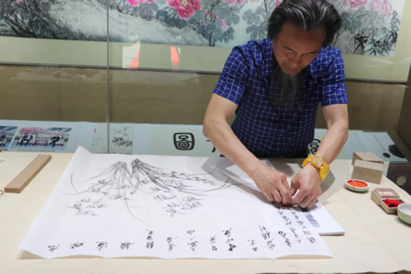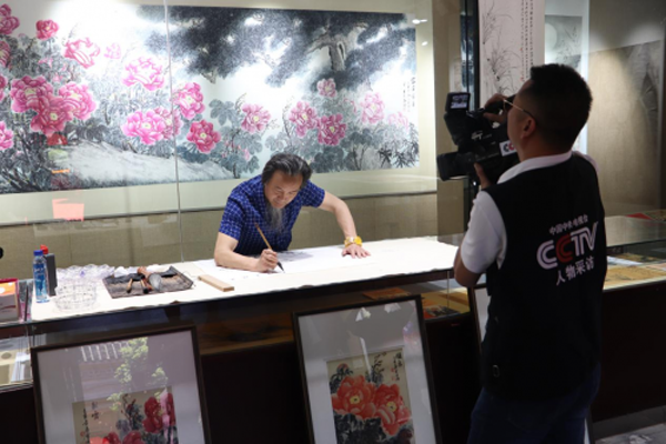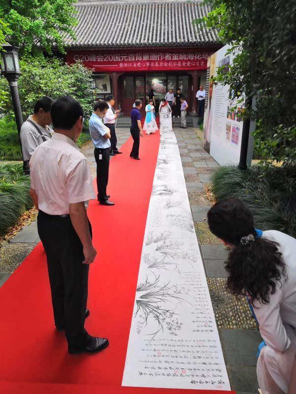 这次画展展出的62幅作品,见证了他一路走来的艺术历程。有从前作的、已经印在画册上的画,有挂在人民大会堂和G20峰会会场的牡丹图的一比一复制画,也有为了这次展览新作的画。比如那幅20米长的《百兰图》,金晓海一夜没睡创作出了主体部分。被誉为“兰花才子”的他,用这幅图向这次画展的参观者们致意。“通过画展的形式,多听听大家的批评,知道自己的缺点在哪里,才能够继续提高。”