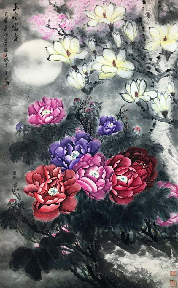 “用古人于新意,以我法造天地”,金晓海在传统画派的基础上力求创新,大胆突破,创造出一种既蕴涵了深厚传统文化又有时代新意的作品。比如当天展出的《古宅春韵》,就是这样一幅作品。具有典型明清风格的雅室内八仙桌上放着一卷古书,青花瓶内一束牡丹,透过窗棂,庭院内几束玉兰竞相怒放。虽然也是牡丹图,但这幅图却完全以水墨画成,古色古香,内暗外明的光影效果,交织成一幅幽静古雅而又生机勃勃的书香门第的画面。