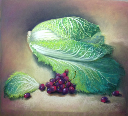 這幅名為《白菜》的作品,看似題材平凡,卻蘊含著藝術家深厚的功力與巧思。在畫面上,一棵飽滿的白菜靜置於古樸的背景中,每一片菜葉的脈絡、邊緣的些許枯黃、葉片上凝結的晶瑩水珠,都被描繪得栩栩如生,質感逼真到幾乎可以觸摸。光線溫柔地灑在白菜上,勾勒出豐富的明暗層次,賦予了這棵尋常蔬菜以紀念碑般的莊重與美感。