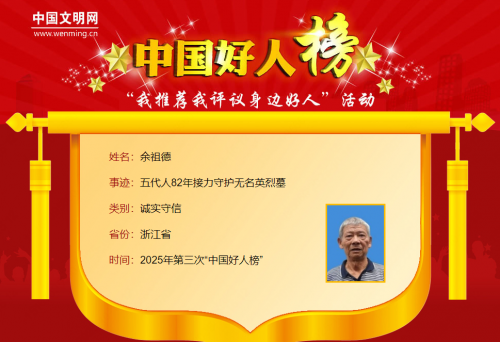 余祖德的事迹经媒体报道后,引发社会广泛关注。他先后获评“武义好人”“金华好人”“浙江好人”,如今更荣膺“中国好人”。这份荣誉,不仅属于他个人,更是对这段跨越五代、历时八十三载的家国承诺最崇高的礼赞。青山依旧,忠魂长存,余家的守护故事,仍在继续书写。(王东方)