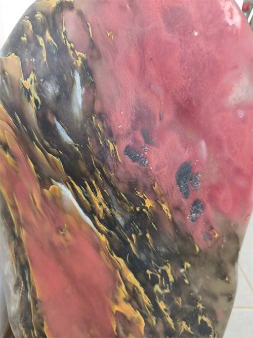 地上摆放着的一座五彩石,暗红如湿润之水,触感细腻如丝绸,重达50多斤,稳如磐石。林苏娥笑言,这正是陨石与玉石之别。她珍藏众多几十斤至上百斤的陨石,虽外表如普通鹅卵石,却是千万年前坠落地球,经河水冲刷,虽失熔壳气印,但仍蕴藏宇宙奥秘。