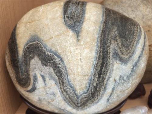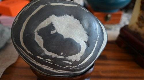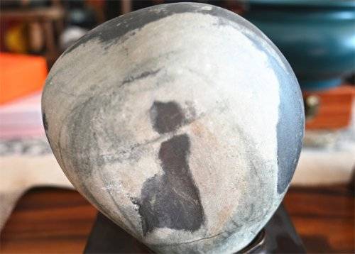 林苏娥的收藏馆中,各种奇形异石令人惊叹不已,甚至有的让人以为是雕刻出来的。有的如金童玉女、有的如虎踞、有的如盘蛇吐信……有一方《乌牛憩水》,黑白相间,如月夜水墨。石上虽无牧童,却仿佛能闻笛声悠扬,见蓑衣少年。唐代吕洞宾的诗句跃然石上:“笛弄晚风三四声……不脱蓑衣卧月明。”