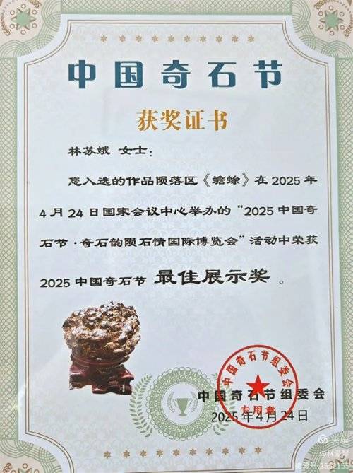 2025年4月,在“2025中国奇石节·奇石韵陨石情国际博览会”上,其作品《蟾蜍》获“最佳展示奖”,《小鸡抓虫》获“金奖”。